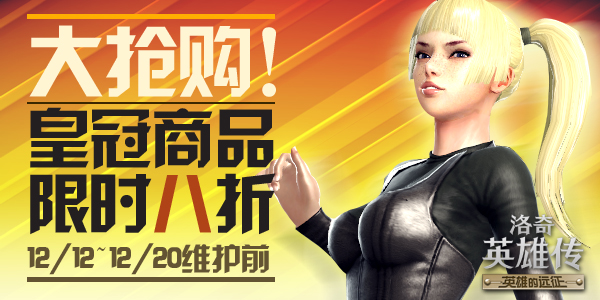 自12月12日至12月20日维护前,“英雄的远征”商城庆祝活动“限时低价抢购”就将火辣开放。活动期间,金冠商品“强化保护石(活动)”、“黄金战币(活动)”、“克劳迪娅染色药剂(活动)”、“附魔保护石(活动)”以及“解除绑定药水(活动)”都将直降至原价的80%,进行限时低价抢购活动!机不可失,失不再来!如此慷慨的活动,错过是不是太可惜了呢?!赶快行动吧!