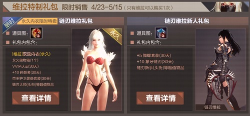 4月23日至5月15日期间,两款超值礼包将于商城开展限时限购!“链刃维拉新手礼包”内包含稀有的AP胶囊、女神祝福石、以及礼包专属的“链刃新手”头衔!而“链刃维拉强力礼包”内容更是精彩,永久储物箱、永久内衣、1000AP胶囊等等商城道具,以及该礼包专属的“链刃大师(头衔)”千万不要错过哦!