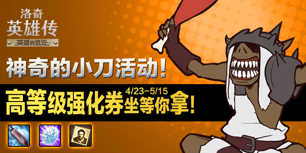 4月23日开始至5月15日维护前的活动期间,“神奇的小刀”让您成为强化达人,活动时间内,玩家只要将“神奇的小刀”道具强化至+11或以上时,可以与NPC奇怪的旅行者交换同强化等级的强化券!兑换所得的强化券100%强化成功只升不降哦!更值得一提的是,强化小刀的成功率可是很高的哦!
