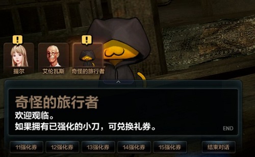 强化的秘诀是什么呢?秘密就是——锵锵锵!“神奇的小刀”!别看这把刀小小的,没啥攻击力,它可是兑换100%强化礼券不可缺少的东西,当我们把“神奇的小刀”强化至+11~+15的时候,就可以和NPC奇怪的旅行者兑换100%成功的强化礼券啦。