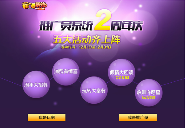 岁月带来成长,也记录过去,在大家的陪伴下,推广员系统已经走过了两年,在迎来两周年的这个冬日,让我们一起欢庆吧,纪念她的成长!当年系统初创,她摸索前行,而今她脚步稳健,呼朋引伴,坚定前进,其中每一步都离不开推广员的努力,同时更离不开广大玩家的支持。在这特别的日子里,我们当然要好好庆祝一下,并借此机会真情回馈,于是,五大活动隆重开启咯!